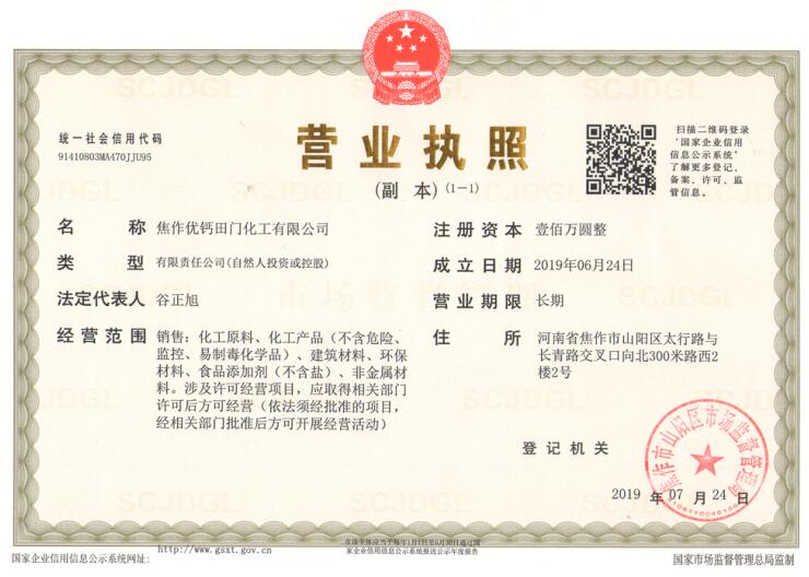焦作優鈣田門化工有限公司,秉承“務實、創新、”的作風和“外樹誠信形象,內育職業忠誠”的道德要求,經過多年的堅持和努力,從一個設備老舊,年產2萬t,固定資產500萬的小企業田門化工有限公司發展成固定資產5000多萬,年產20萬t多樣化碳酸鈣系列產品的優鈣田門化工有限公司,公司位于河南省焦作市山陽區太行路與長青路交叉口向北300米。